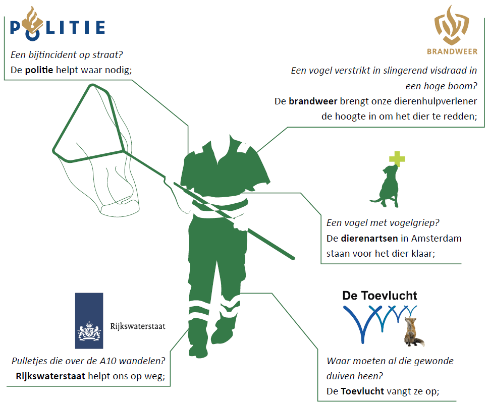 Dierenambulance Amsterdam staat 24 uur per dag, 7 dagen per week klaar voor dieren in (medische) nood. Dit kunnen wij doen dankzij de hulp van onze donateurs, vrijwilligers en iedereen die ons op wat voor manier dan ook ondersteunt. Wij kunnen niet iedereen apart benoemen, maar zijn heel dankbaar voor alle steun en samenwerkingen.